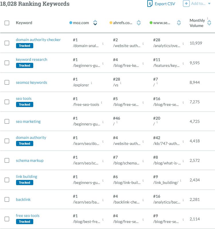 True Competitor pulls ranking keywords (by highest-volume) for any domain in our Keyword Explorer database — even your competitors’ and prospects’ domains — and analyzes recent Google SERPs to find out who you’re truly competing against.