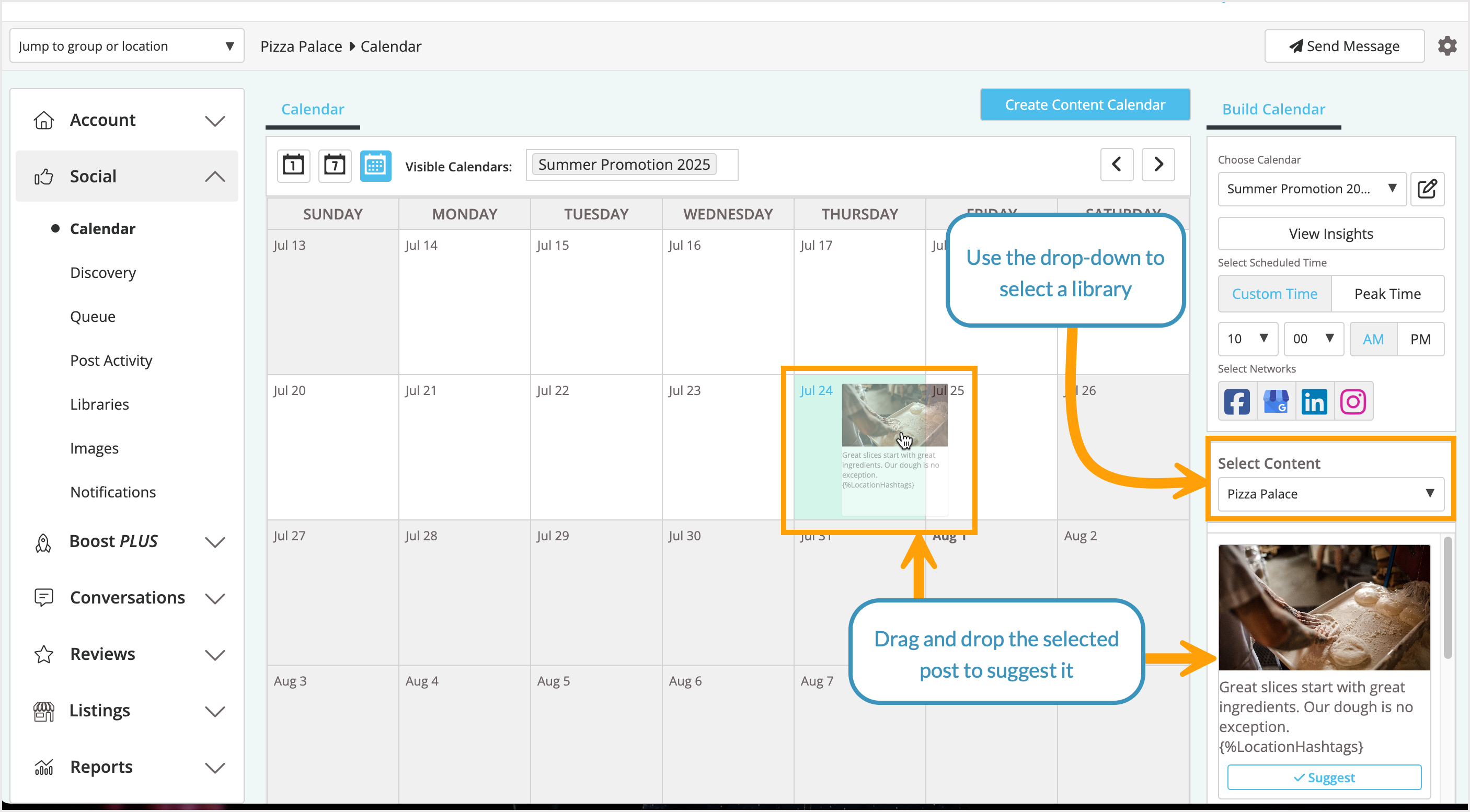 To add content to your content calendar from an existing Library, use the drop-down on the right-hand side to select a library and then drag and drop the chosen post to suggest it.