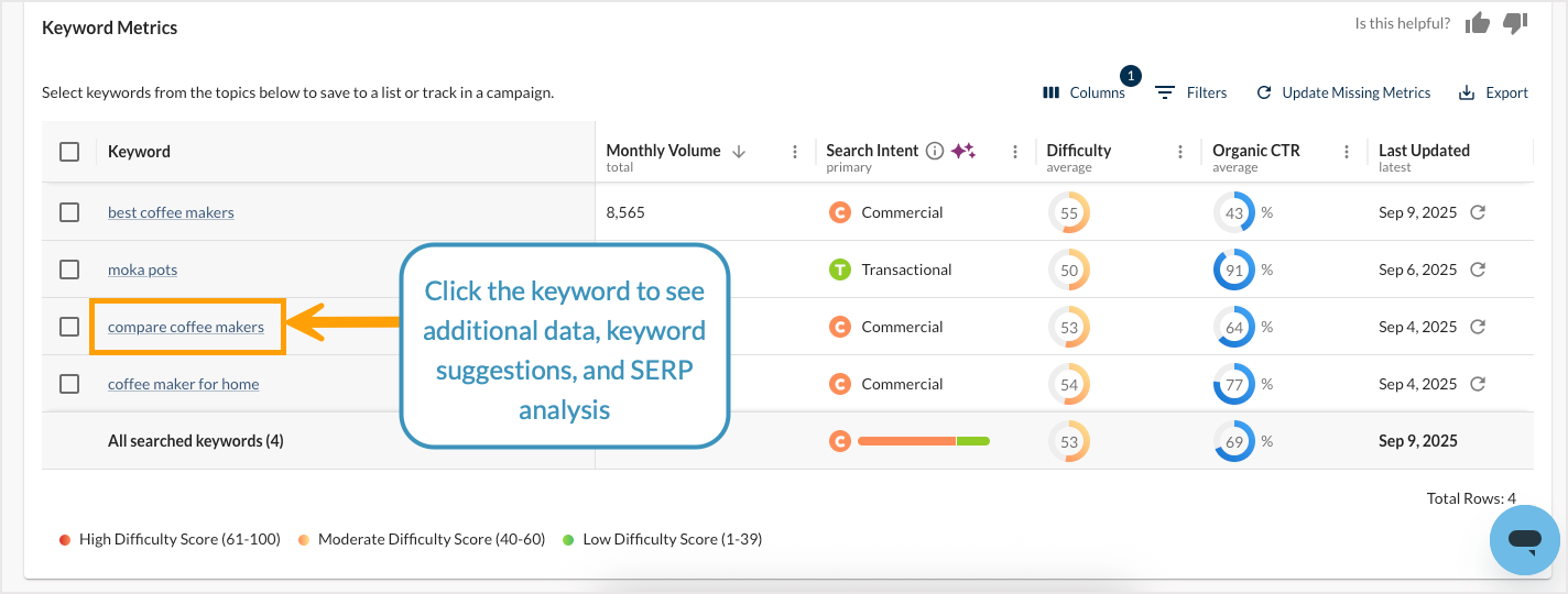 To see additional data for a queried keyword, including a preview of keyword suggestions and a full SERP analysis, click the keyword itself.