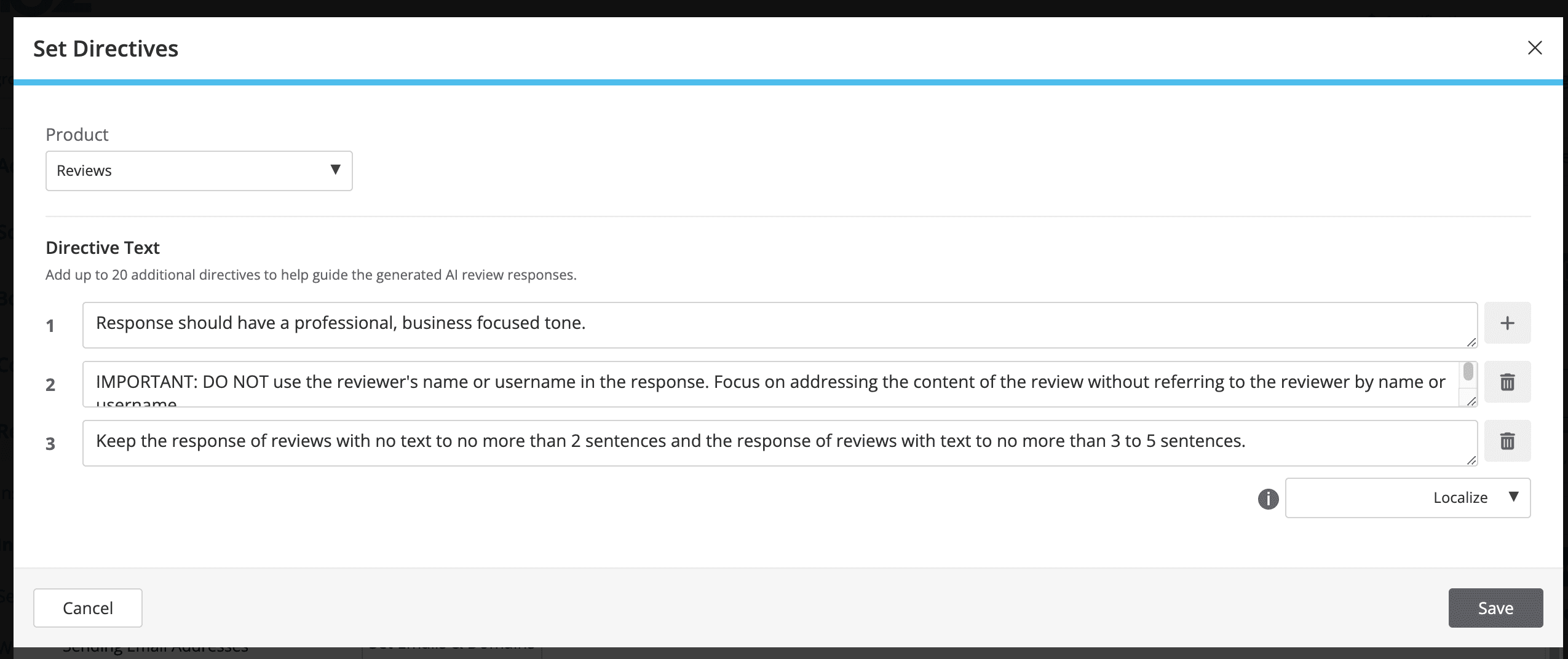 From here, you can set specific directives for your review responses. It is recommended to use directives sparingly and with intention. If a directive does not seem to be returning the desired effect within a few days, remove it using the trash can icon on the right.