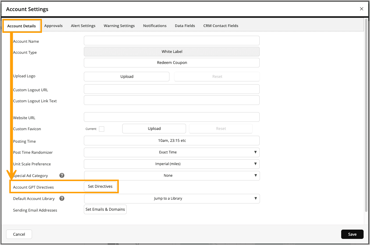 To add AI directives to your account, click the gear icon on the top right of your account. This will open your Account Settings. Within Account Details, scroll down to Account GPT Directives. Click Set Directives.