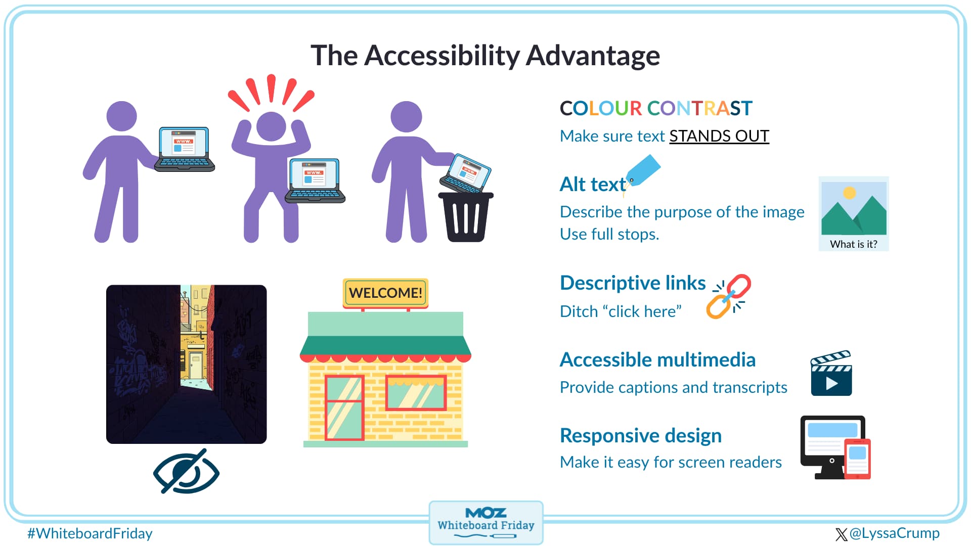 Your website is just like that. An accessible site says, “Hey, we’ve got something for you!” to users and search engines, while an inaccessible site says, “You’re not welcome here.”
