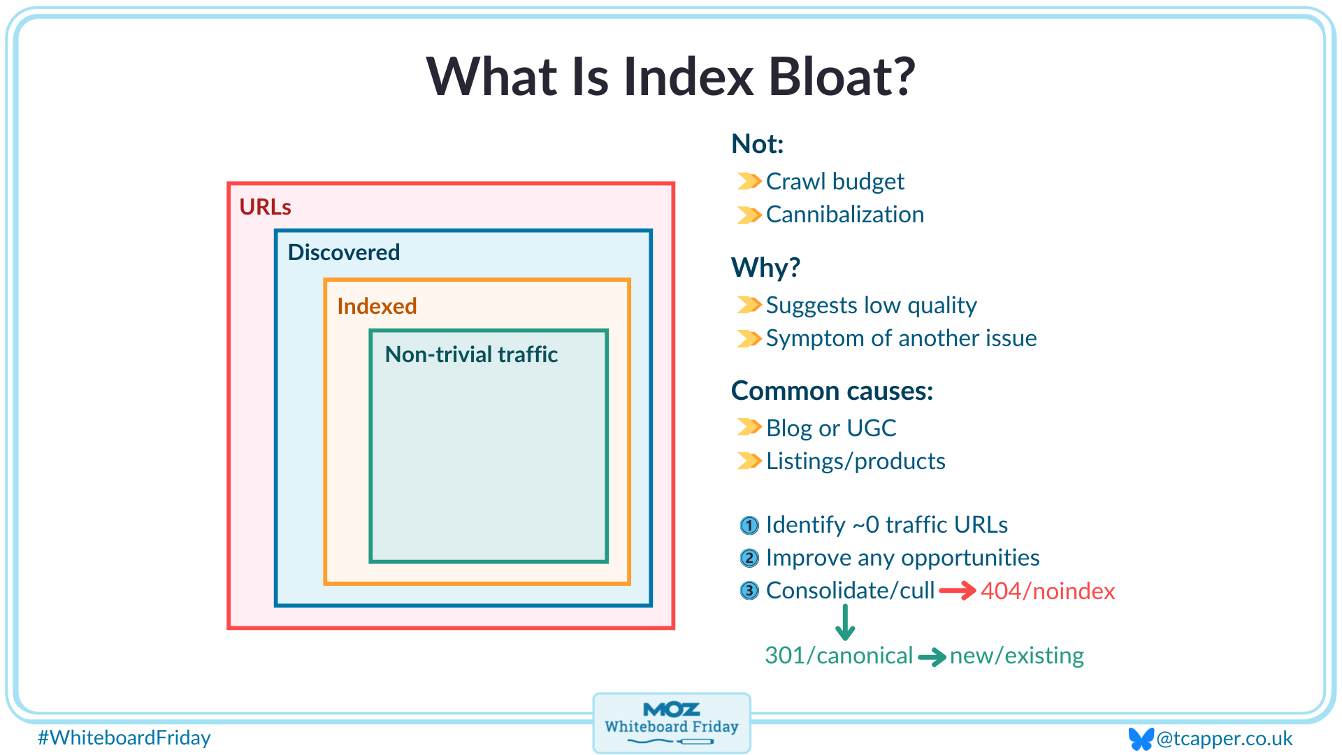 Deep dive into index bloat - a critical SEO challenge affecting medium to large websites. Learn how to identify URLs consuming your index quota without delivering traffic, understand the difference between crawl budget and index bloat, and discover practical solutions for cleanup. This Whiteboard Friday video helps you assess your site's index health and implement effective remediation steps, from content consolidation to proper URL handling.